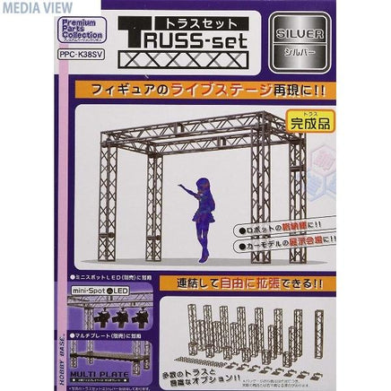 ステージや展示会などにあるトラスをノンスケールで立体化、アイドルフィギュアを飾れば簡単にライブ会場の出来上がりです!アイデア次第で様々なディスプレイが可能に、ロボットモデルの格納庫やカーモデルの展示会場にも。連結して自由に拡張でき、多数のトラスと豊富なオプションで組み替え拡張が可能、様々なサイズの展示物に対応。ミニスポットLED (別売)に対応:付属の接続パーツで、ミニスポットLEDを舞台照明の様にトラスに接続可能。パワーユニット (別売)の接続コードに対応:付属の固定パーツで、パワーユニットの接続コードをトラスに固定可能。マルチプレート (別売)に対応:付属の接続パーツで、マルチプレートの上下にトラスを接続可能、ステージの床を再現できます。トラスの長さはマルチプレートの規格に合わせてあり、連結してもジャストフィット。モデルカバー (別売)に対応:モデルカバー各種 (小・HIGH小・横長・特大・超横長)の底面ベース規格に合わせてあり本格的なミニチュアライブステージを再現可能です。