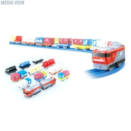 日本最大の巨大機関車「金太郎」がプラレールで登場。迫力の大編成!ハイパワーモーター使用のEH500金太郎(3次車)と、新しいデコレーションの貨車を3タイプ全10両をセットしました。貨車のうち4両は8つのコンテナを載せ換えて遊べます。連結する場合は動力車を含めて最大8両までにしてください。使用電池:単2×1(別売)。