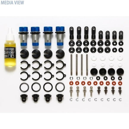 走行性能を高めるアルミ製オイルダンパーです。キット標準のフリクションダンパーに比べてストローク量を増やし、オンロードはもちろん荒れたオフロードでも路面追従性がアップします。また、ピストンやOリング、ダイヤフラムなどは、ツーリングカー用アルミオイルダンパーと互換性があるのも嬉しいポイント。シリンダーはシルバー、上下キャップはブルーアルマイトとしてドレスアップ効果も発揮します。オイルとスプリングは別売。(ITEM 54670)【適応車種・パーツ】GF-01、WR-02シャーシ